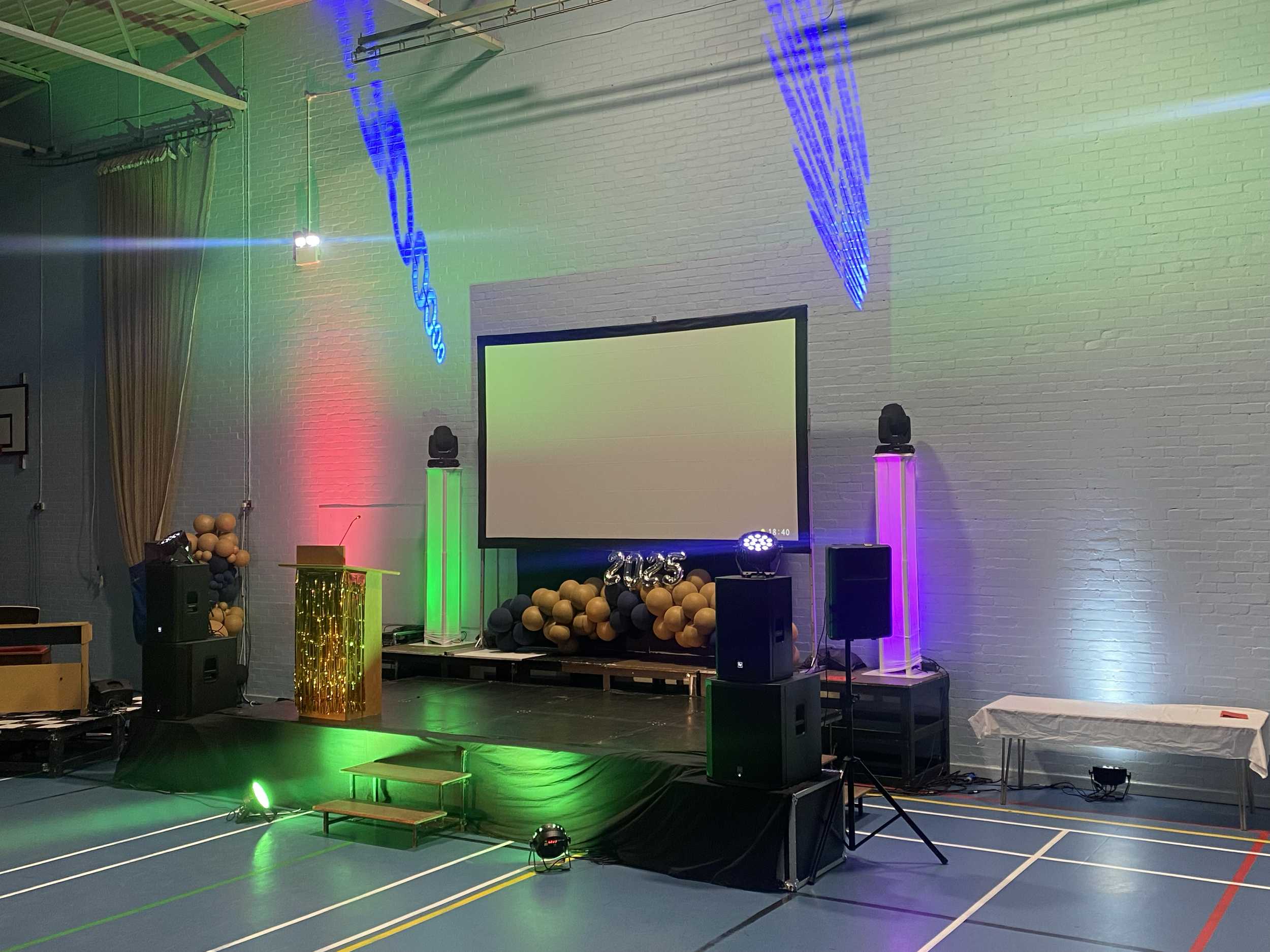 Event stage setup with colorful lighting, large screen, black balloons, and a diploma or award, in a gymnasium with a basketball hoop and sports court lines.