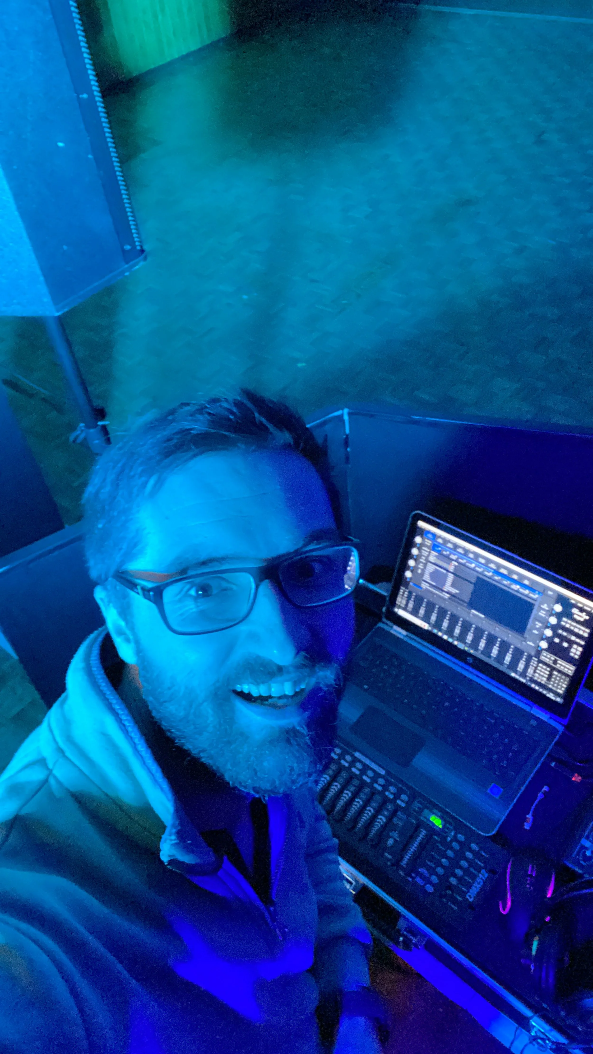A man with glasses and a beard taking a selfie in a dark room with blue lighting, sitting at a DJ booth with a laptop displaying music production software.
